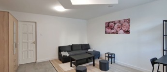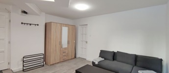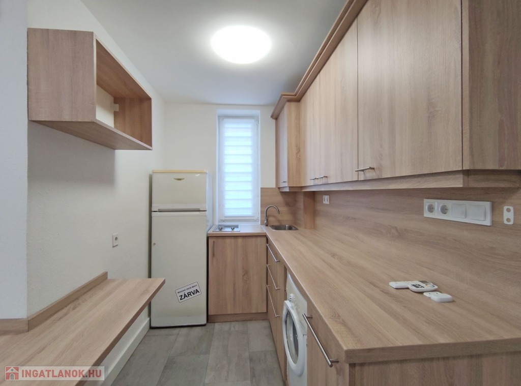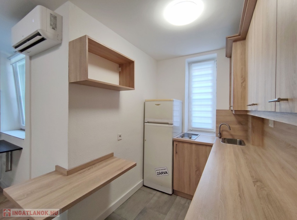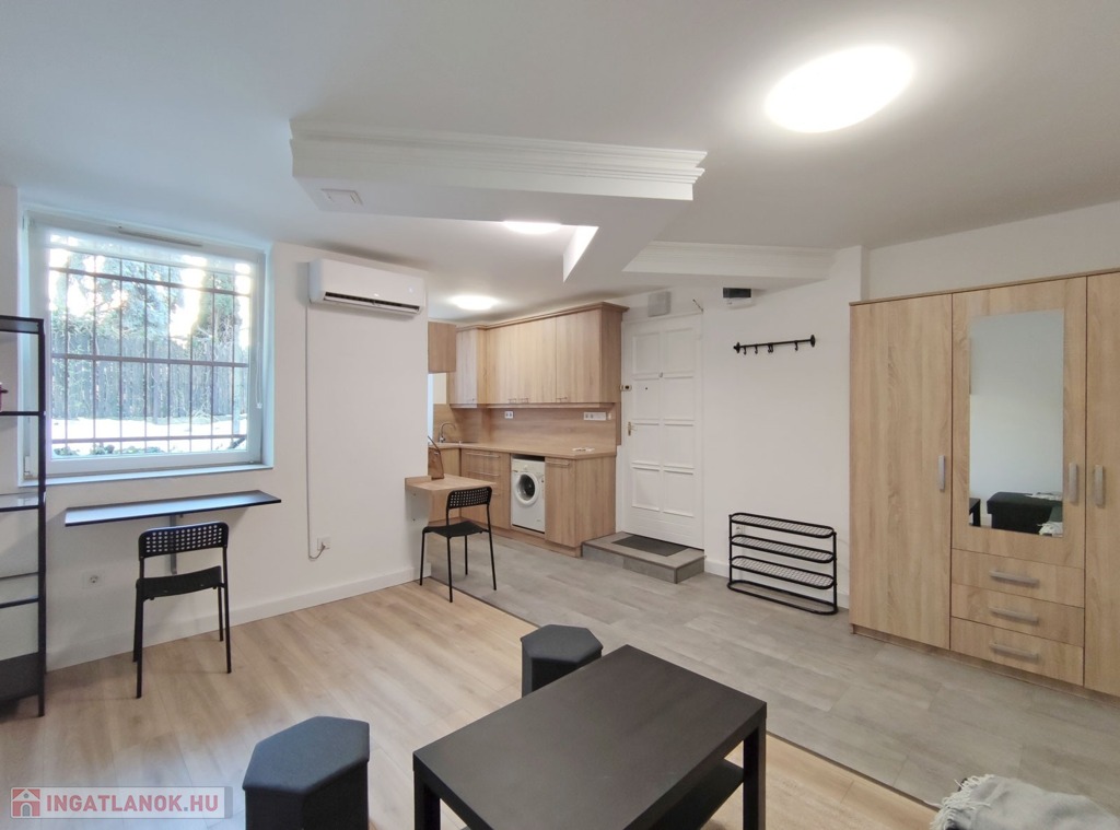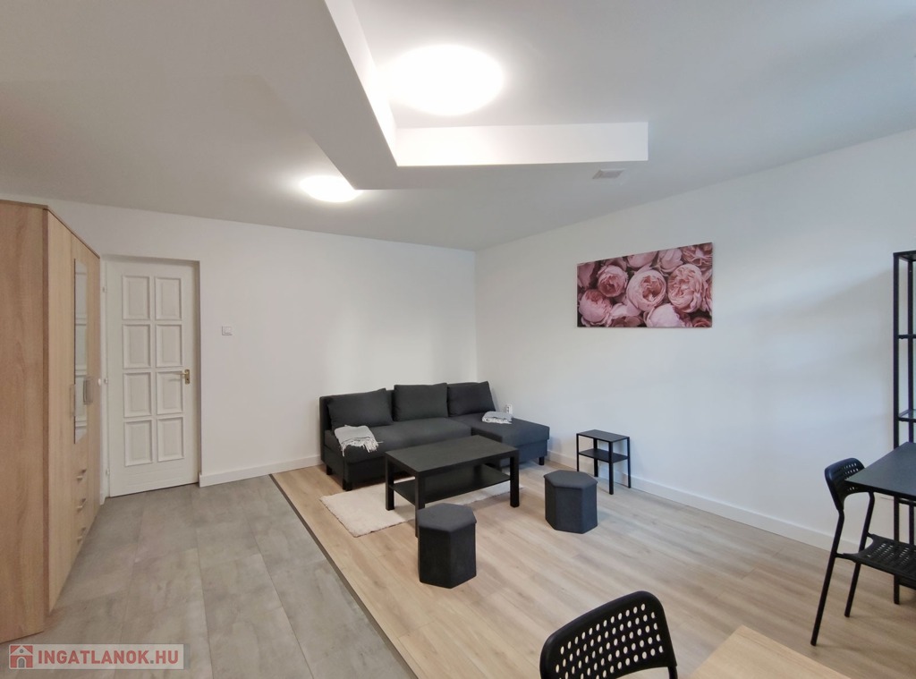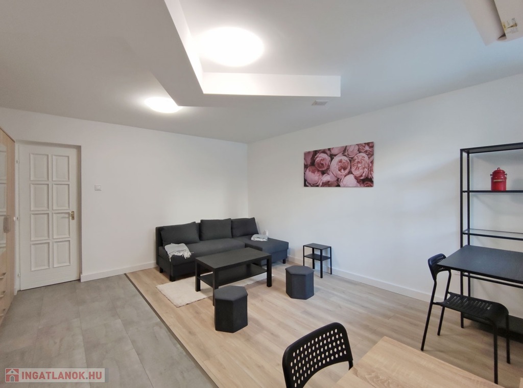 A földszintről lefelé hét lépcső vezet a lakásba, belépni a ráccsal ellátott, több ponton záródó biztonsági ajtón keresztül tudunk. A teljes körűen felújított, frissen festett, bútorozott tágas nappaliba lépünk be, amely részben járólappal , és parkettával burkolt, így növelve a kényelmet és a teret. Vele egy légtérben található, a gépesített elektromos tűzhellyel , mosogatógéppel ellátott bútorozott ablakos konyha. A szoba ablakából a körbekerített belső zöld udvarra látunk, amit jelenleg a házból nem használnak a lakók, ezért van lehetőség arra hogy grillezős, pihenős környezetté alakítsa az új lakó és reggelente a friss levegőn kávézhasson.