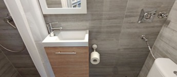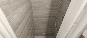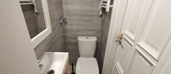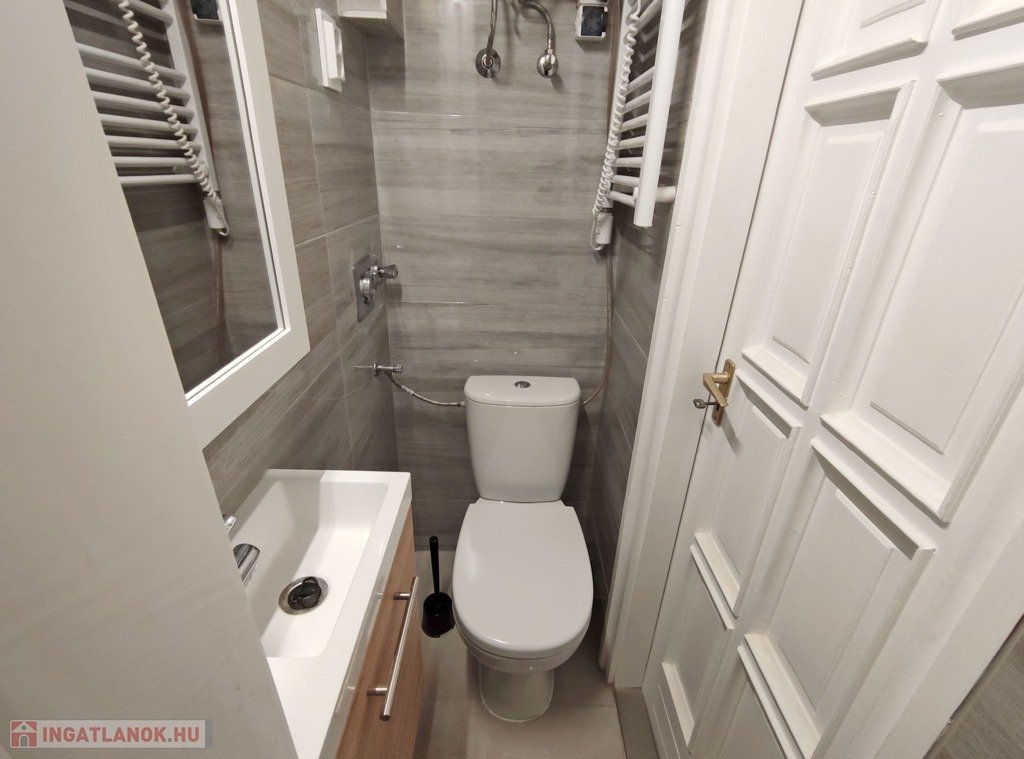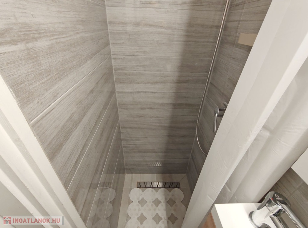 A nappaliból balra nyílik a szintén újonnan burkolt zuhanyzós kialakítású fürdő, itt kapott helyet a WC -is.