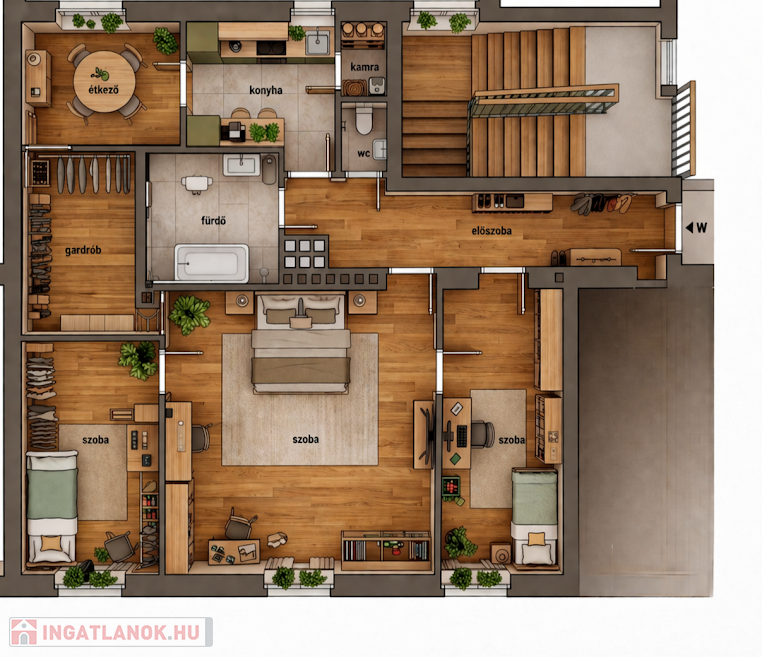 Bal oldalon 3 külön bejáratú, napfényes szoba található (12 m², 21 m², 8 m²).