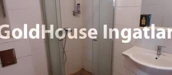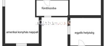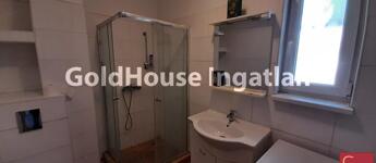 A főépület elosztása: 27 nm-es előszoba-amerikai konyhás nappali, melynek két oldalán is vannak kertre néző ablakok, így világos. A mellette lévő utcai ablakos helyiségből nyílik a fürdőszoba-WC és a szintén utcára néző hálószoba. A fürdőszoba zuhanyzós, kellemesen tágas, ablaka kertre nyíló, a meleg vizet villany bojler adja.