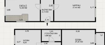 A földszinti részen, konyha, nappali, étkező, szoba, kamra, közlekedő, fürdőszoba, mellékhelyiség és terasz található. Az emeleten 4 szoba, hall, fürdőszoba és erkély került kialakításra.