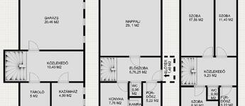 A földszinten konyha, egy tágas nappali (igény esetén a nappaliból még egy szoba leválasztható), fürdőszoba és beépített terasz található. Az emeleten 3 szoba, nappali, fürdőszoba, illetve a padlásfeljáró kapott helyet. A ház alatt egy 41 m2-es pince van, ahol a kazánhelyiség, garázs és tároló került kialakításra.