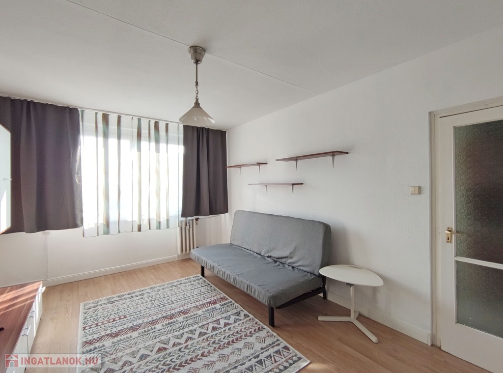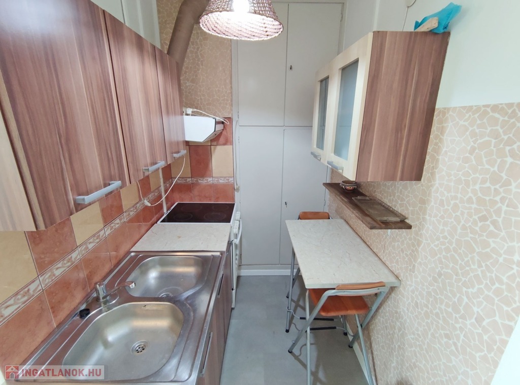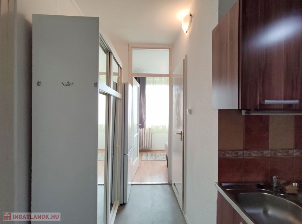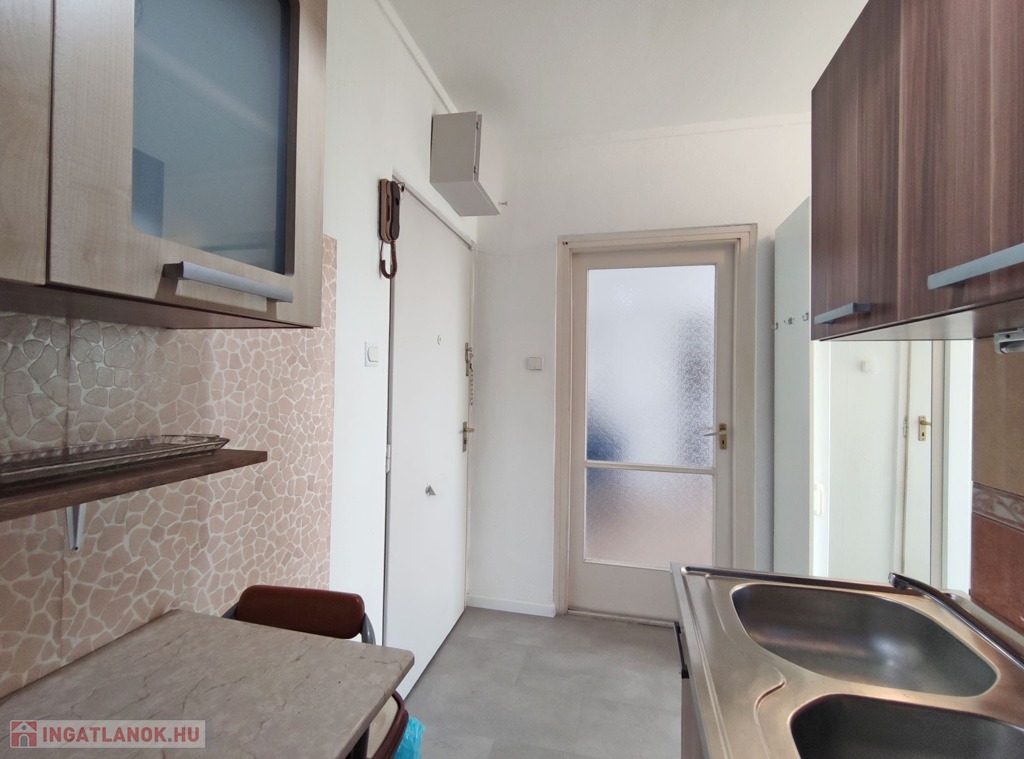 Belépve a közlekedőből balra nyílik a 18,3 mn-es nappali , amit laminált parkettával burkoltak, Dél-Nyugati fekvésének köszönhetően napfényes, nyáron a hűtéséről klíma gondoskodik. Szemben nyílik az ablakos, szintén napfényes laminált parkettás félszoba. Jobbra a közlekedővel egy légtérben található a gépesített 3,85 nm-es konyha, bútorzata újszerű, amely a vételár részét képezi, 6 éve eset át egy tejleskörű felújításon.