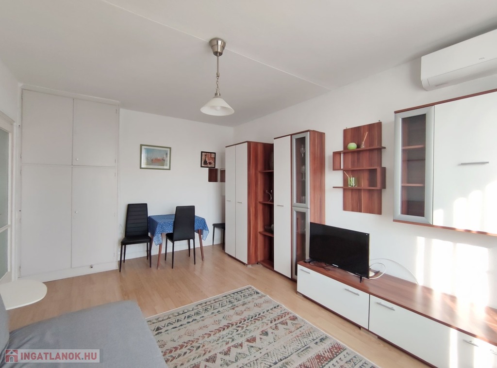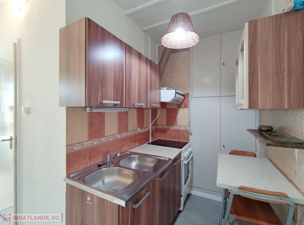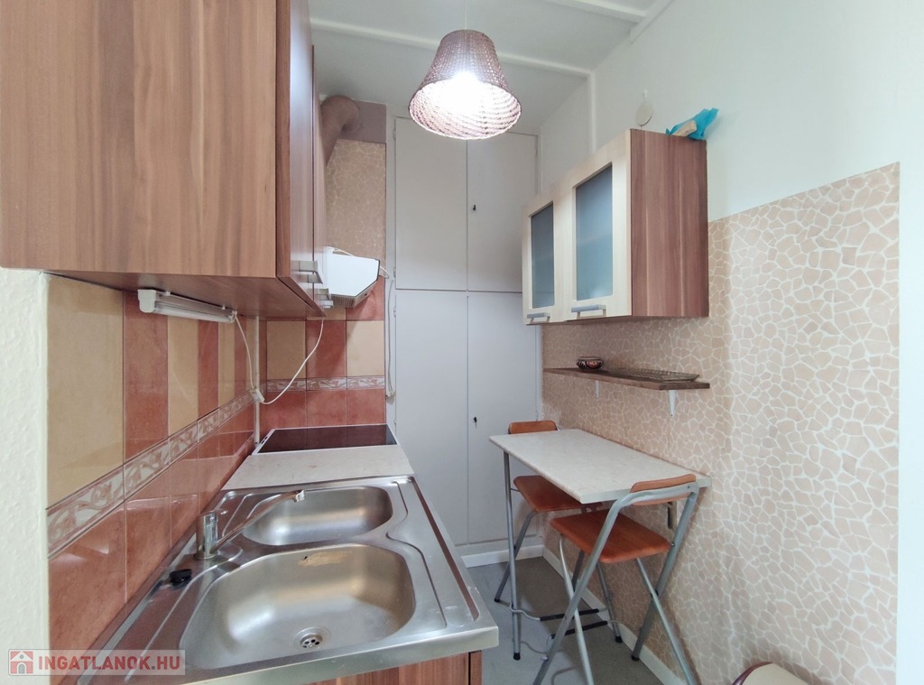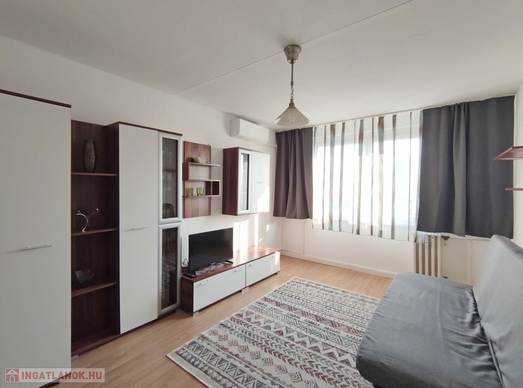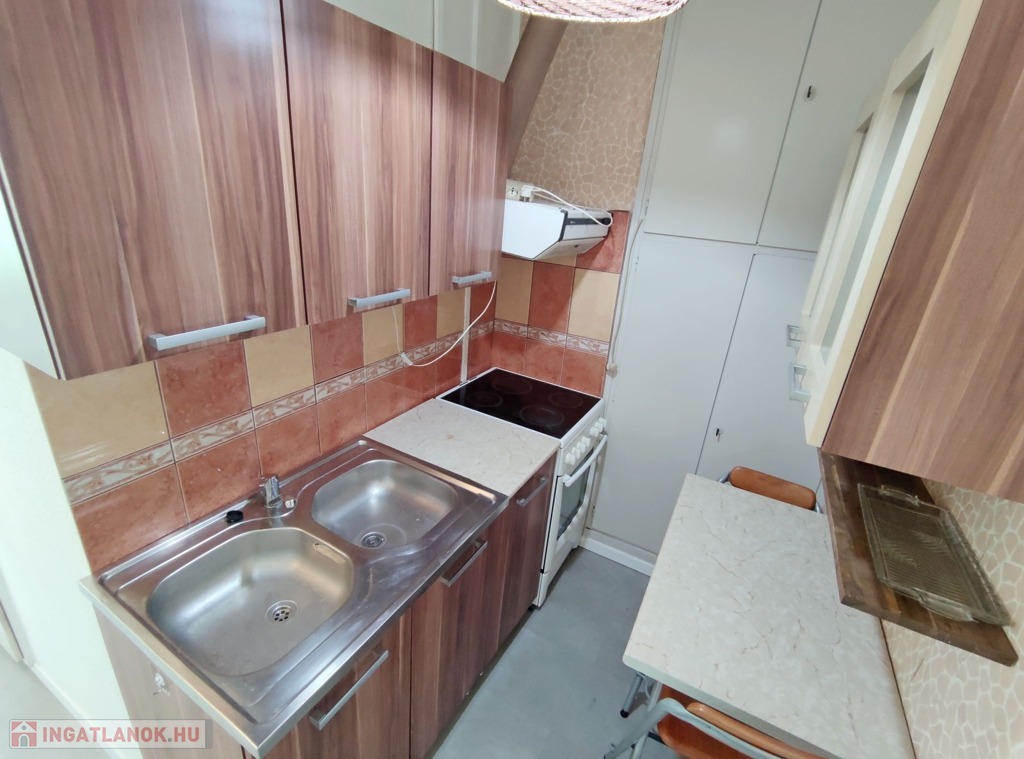 Belépve a közlekedőből balra nyílik a 18,3 mn-es nappali , amit laminált parkettával burkoltak, Dél-Nyugati fekvésének köszönhetően napfényes, nyáron a hűtéséről klíma gondoskodik. Szemben nyílik az ablakos, szintén napfényes laminált parkettás félszoba. Jobbra a közlekedővel egy légtérben található a gépesített 3,85 nm-es konyha, bútorzata újszerű, amely a vételár részét képezi, 6 éve eset át egy tejleskörű felújításon.