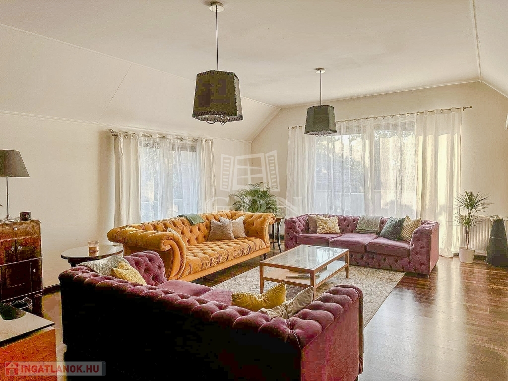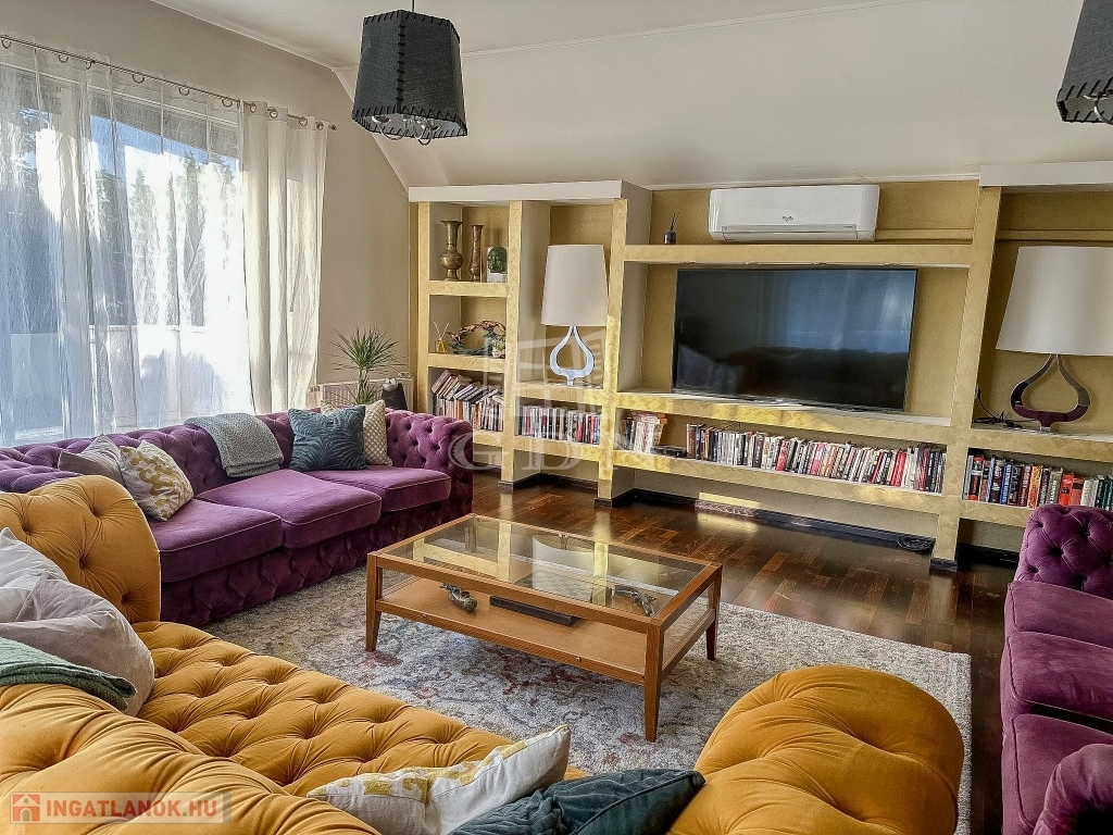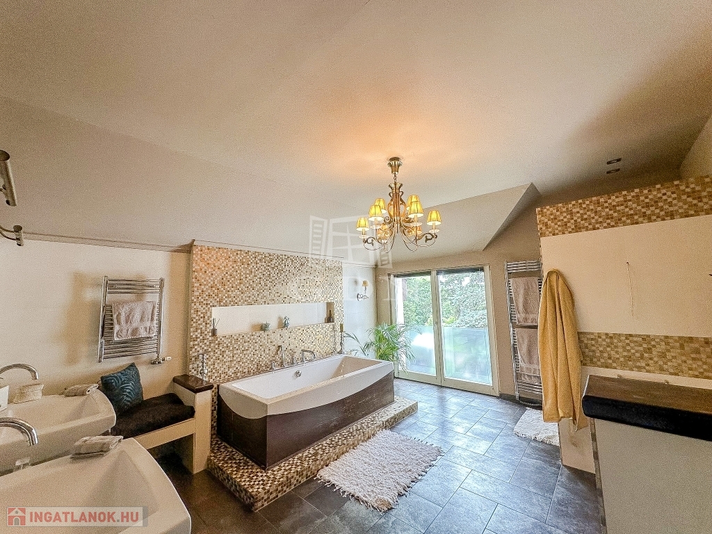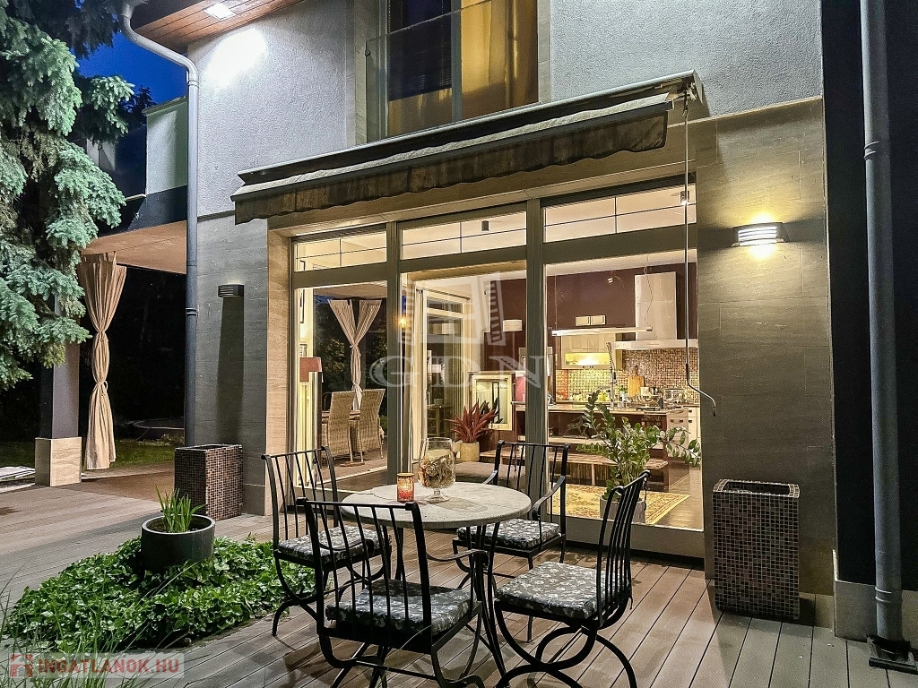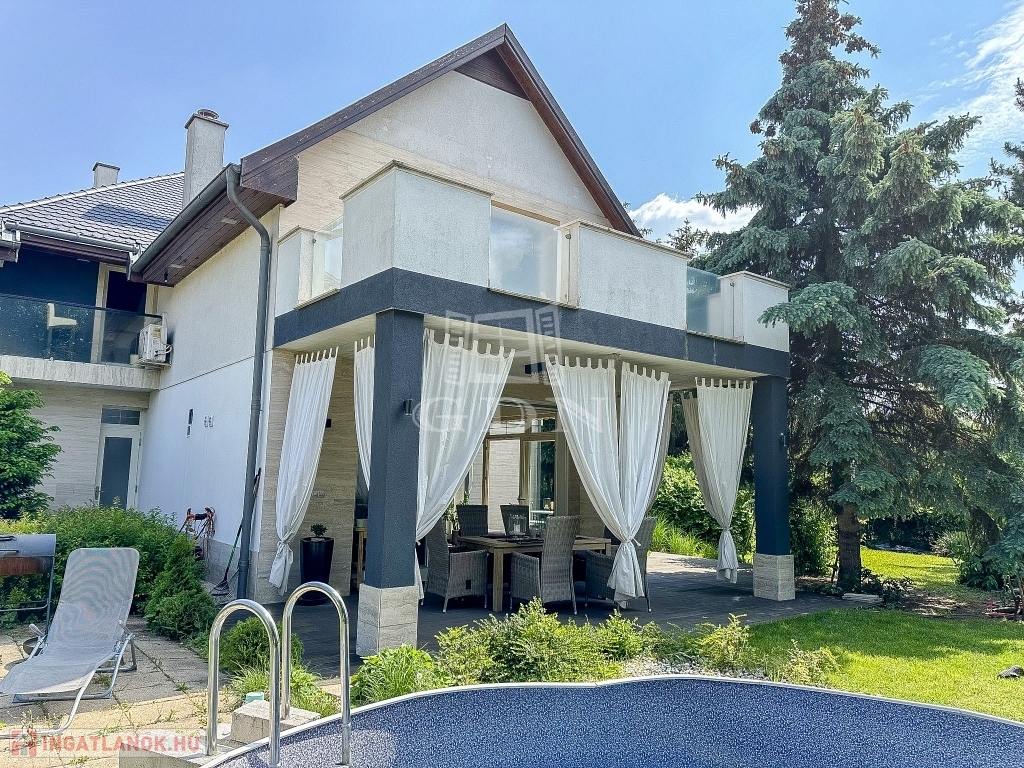 XVI. kerületben, Sashalmon, közel a kilátóhoz, kertvárosi környezetben, a pesti oldal legmagasabb pontján, 1107 nm-es telken lévő, 2008-ban épült, újszerű állapotú, nettó 290 nm-es (bruttó 370 nm), 5 szoba - hallos (aula szerű), szigetelt, Dél - Nyugati fekvésű, dupla nagy teraszos, gáz kazán (HMV tartállyal), -kandalló - és hűtő - fűtő klíma fűtéses, 3 fürdőszobás, medencés, rugalmasan birtokba vehető családi ház eladó.