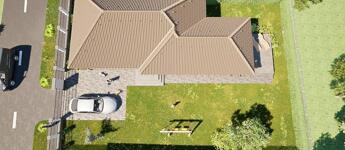 A tető Terrán Zenit cserép fedéssel készült, ami tartósságával és esztétikus megjelenésével tökéletesen illeszkedik az épület modern jellegéhez. A fűtést korszerű hőszivattyús rendszer biztosítja, amely energiatakarékos módon gondoskodik a meleg vízről és a fűtésről, így az ingatlan környezetbarát megoldást kínál. Összességében a ház minden részlete a komfortot, az energiatakarékosságot és a modern életmódot szolgálja, miközben harmonikusan illeszkedik a természetes fényviszonyokhoz.