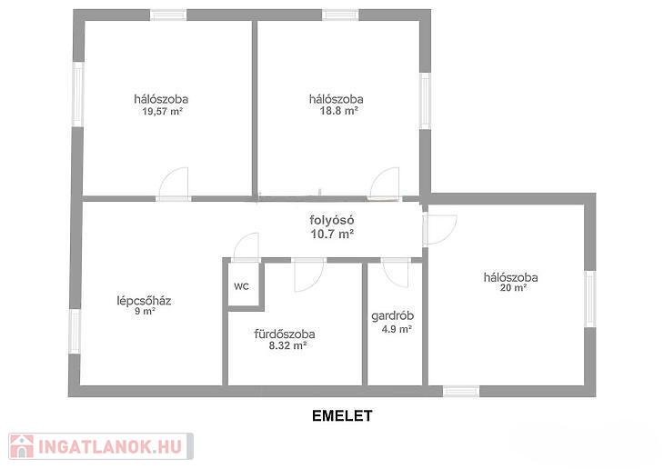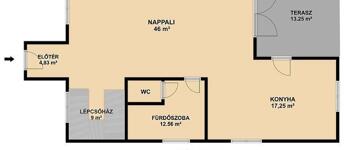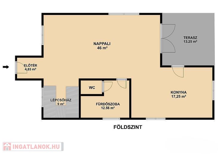 Magasföldszint: tágas, amerikai konyhás nappali (innen nyílik a nagy terasz), fürdőszoba és külön mellékhelyiség, közlekedő és lépcsőház.