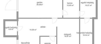 Földszint: 3 szoba (az egyikben szauna és szolárium), mosókonyha, tároló, garázs.