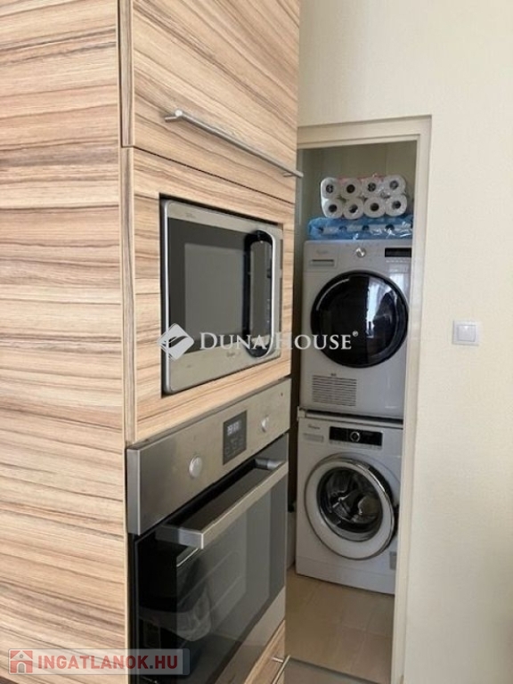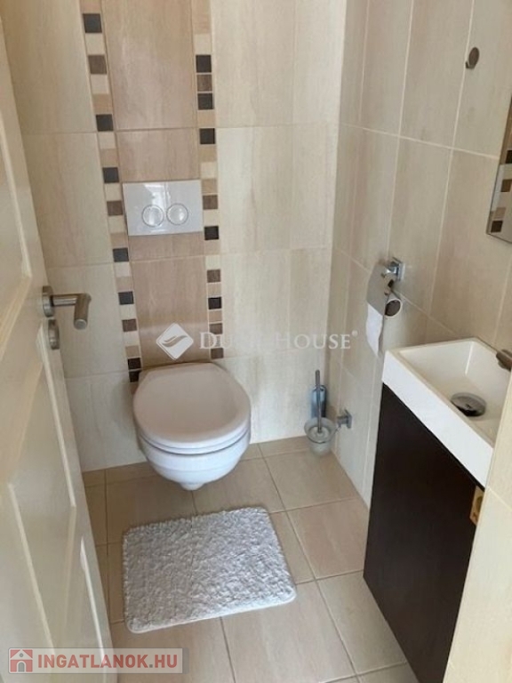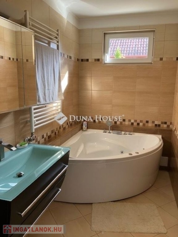 Kamrában lett elhelyezve mosó és a szárítógép. Fürdőszoba tágas, ablakkal kertre néz, WC külön helységben található.