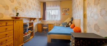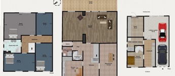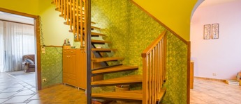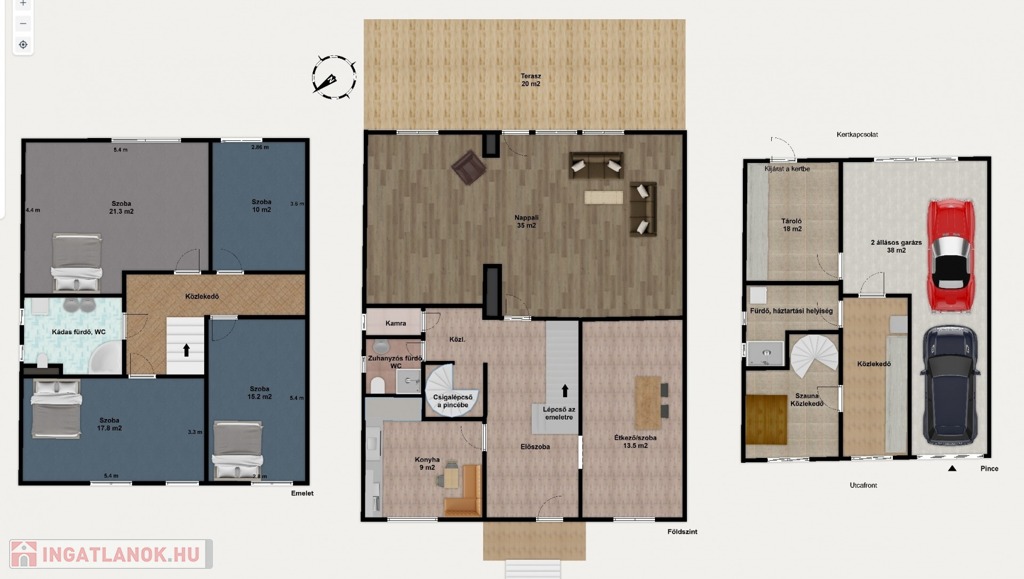 A pinceszinten nagy tároló, két állásos garázs, szauna és háztartási helyiség található, valamint a kertbe közvetlen kijárás is megoldott. A földszinten konyha, étkező/szoba, hatalmas nappali és 21 m2-es, kertkapcsolatos terasz, zuhanyzós fürdő-WC, valamint kamra, az emeleten további 4 hálószoba és egy sarokkádas fürdőszoba található.