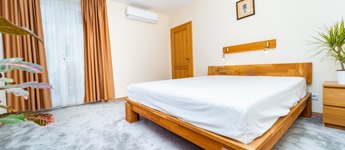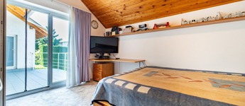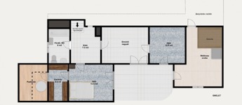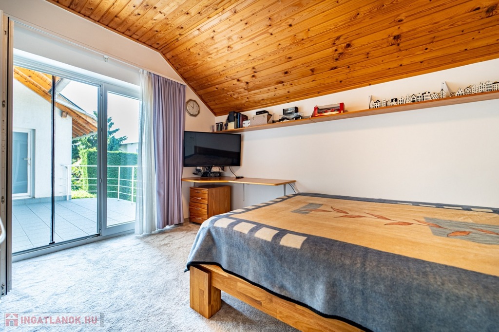 Az alsó szinten a teljes nettó lakótér 107 m2, egy 33 m2-es nappali mellett egy 16 m2-es háló + gardób és saját fürdő, 16 m2-es konyha étkezővel, kamra, külön vendégmosdó és egy 35 m2-es dupla garázs található (a teljes alapterület terasz nélkül 142 m2, a terasz plusz 15 m2), az emeleten, összesen nettó 65 m2-en 2 háló, emeleti nappali, wellnes helyiség szaunával és zuhanyzóval, fürdő, rengeteg tároló és gardróbhelyiség, valamint egy 12 m2-es, déli fekvésű erkély.
