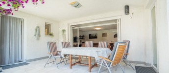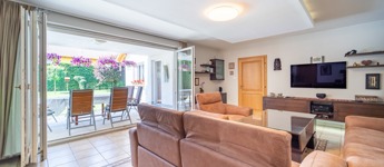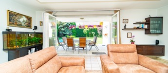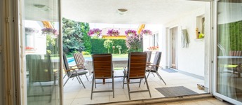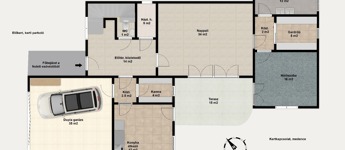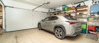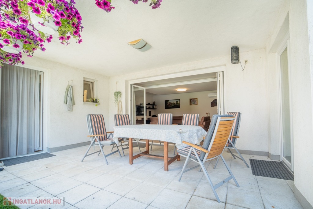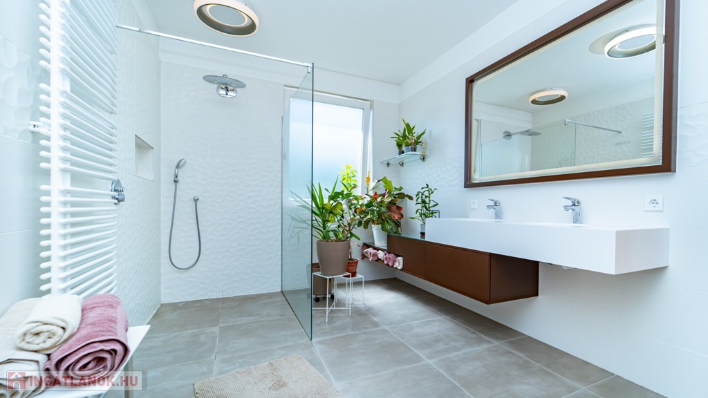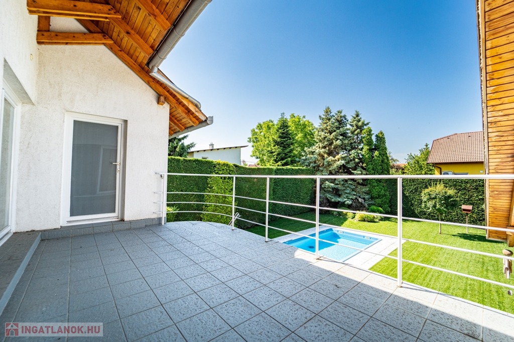 Az előkertben egy nagyméretű, akár lakóautó tárolására is alkalmas, féltetővel kialakított autóbeálló is helyet kapott. A garázs és a főkapu is elektromosan nyitható, a kertész által rendbentartott kertben autómata öntözőrendszer öntöz, a medencének is komplett vezérlése, világítása van az autómatizáláshoz, ráadásul fűthető, napkollektorról.