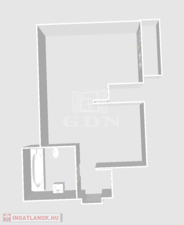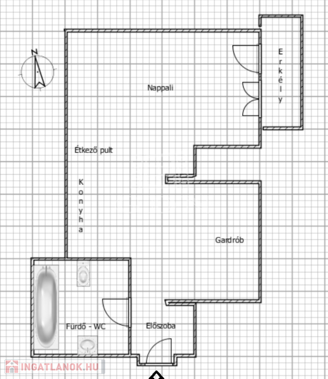 A lakás előszoba, fürdőszoba-WC, gardrób, konyha és nappali helyiségekből áll.