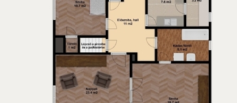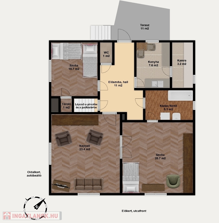 A főépület tetőtere is járható és igény esetén beépíthető, alatta 15 m2-en pince került kialakításra.