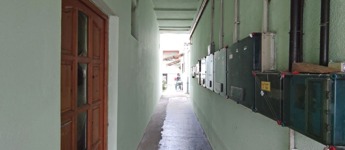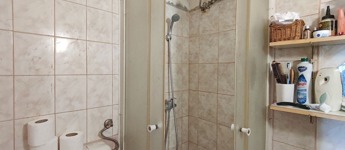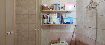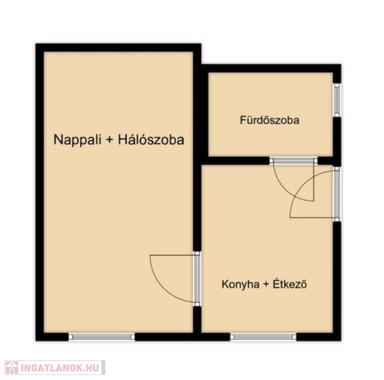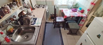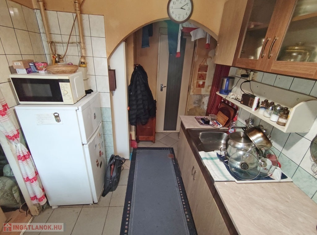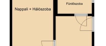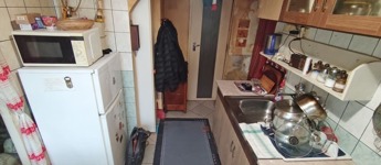 A lakásba belépve a bejárati ajtón keresztül közvetlenül a nyitott világos konyhába jutunk. Innen jobbra nyílik a fürdőszoba, ami teljes felújításra szorul. A konyhából nyílik a nappali ami egyben a hálószoba is.