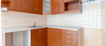 The fitted kitchen furniture includes space for a dishwasher, and the extractor hood can be connected to the central ventilation system.
