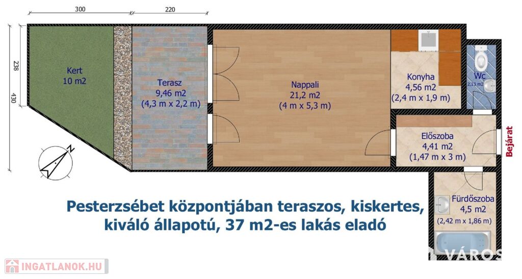 A 37 m2-es, földszinti lakás 26 m2-es, amerikai konyhás nappalival, tágas, kádas fürdőszobával, külön wc-vel, valamint beépített szekrényes előszobával rendelkezik.