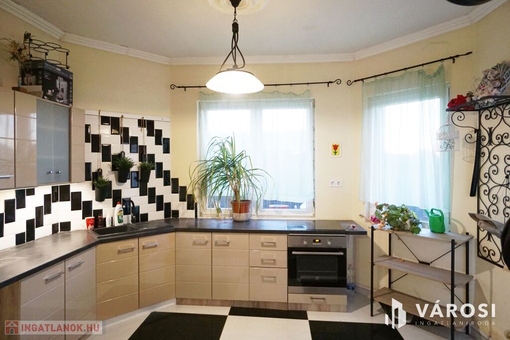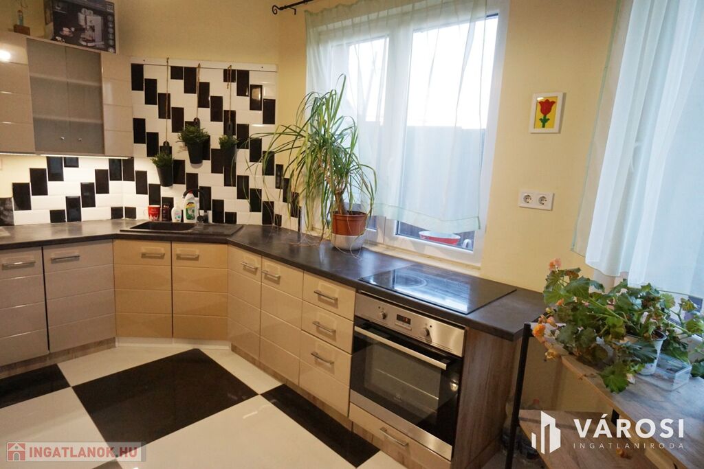 A modern, gépesített beépített konyhabútor a vételár részét képezi.