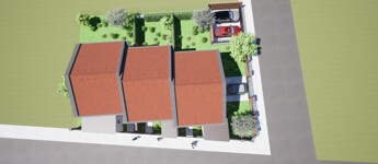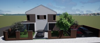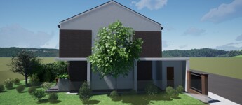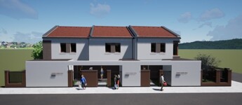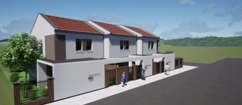 Az egyemeletes, háromlakásos épület modern, törtfehér homlokzatot kap szürke díszítő elemekkel, a látványterveknek megfelelően.