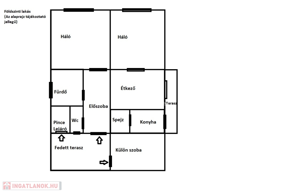 - Fedett teraszról érkezünk az előszobába, 2 szoba, étkező, konyha, spájz, kádas fürdőszoba, külön WC, és tartozik hozzá egy külön bejáratú szoba/tároló