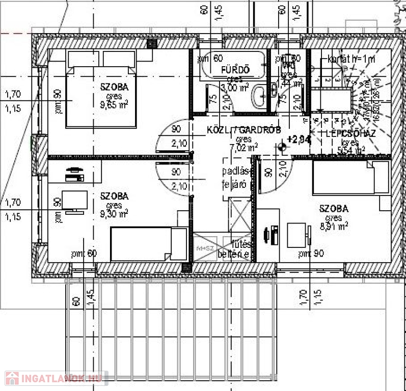 A ház felépítése: földszint + teljes értékű emelet + 8 m² beépített fűthető padlástér (amely egy helytakarékos lépcsőn keresztül közelíthető meg).