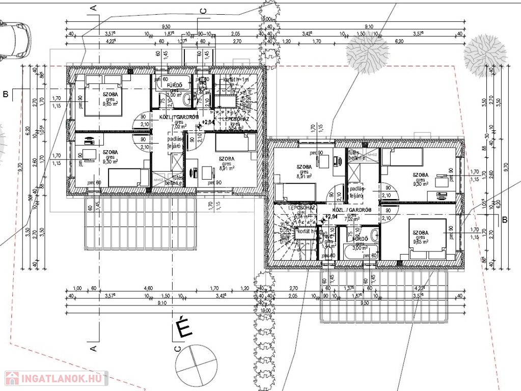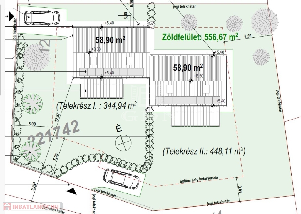Az ikerházhoz 1 db. kocsibeállási lehetőség tartozik ( igény szerint további beállási lehetőséggel is bővíthető ), a hozzá tartozó kizárólagos használatú telekrész 344,94 m².