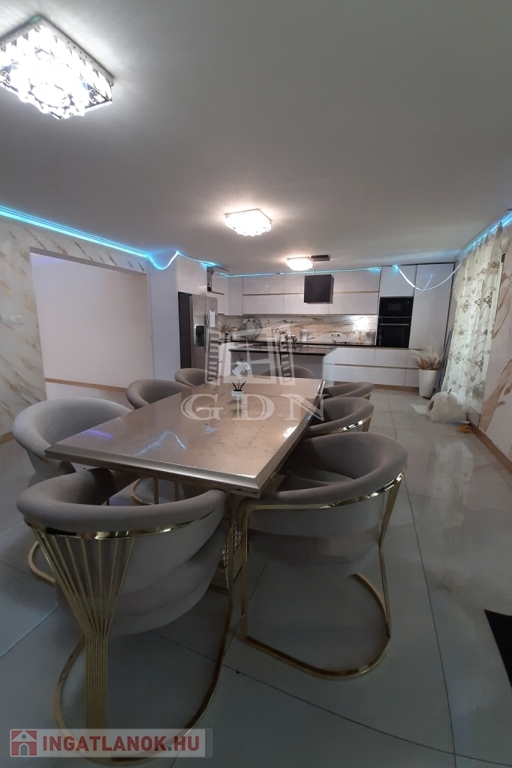 A házba belépve egy tágas nappaliba érkezünk, innen tovább haladva található egy étkezős - konyha, beépített modern konyhabútorral.