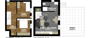 Soroksáron a Templom utcában 61.4 m2-es hasznos lakótérrel és 30m2-es terasszal rendelkező sorház eladó 378m2-es telekrésszel.