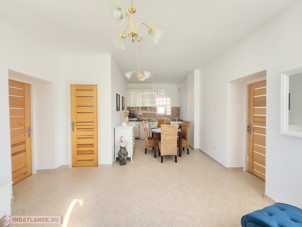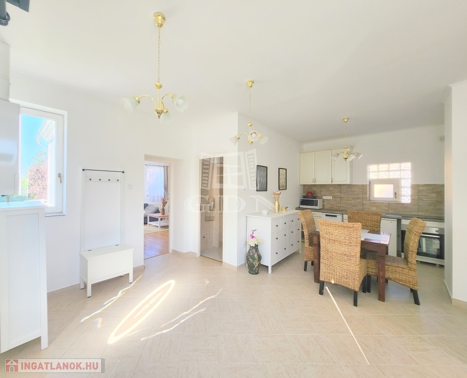 A családi ház kiváló elosztásából adódóan rendelkezésünkre áll egy tágas konyha - étkező, egy 25 m2 nagyságú nappali, mely 3 ablakkal rendelkezik, így nemcsak hangulatos életteret biztosít, de az állandó benapozottsága is garantált. Használhatunk további egy, külön bejáratú hálót, melyhez egy gardróbszoba is tartozik, valamint egy épített zuhanyzóval ellátott fürdőt.