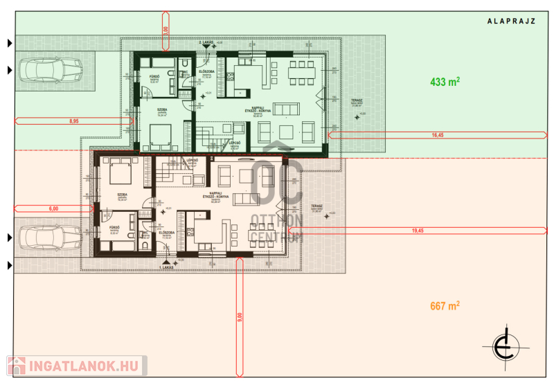Az ikerházak 2.lakása: 147 nm alapterületű, nagy teraszos, nappali + 3 szobás, 433 nm-es telekrésszel.