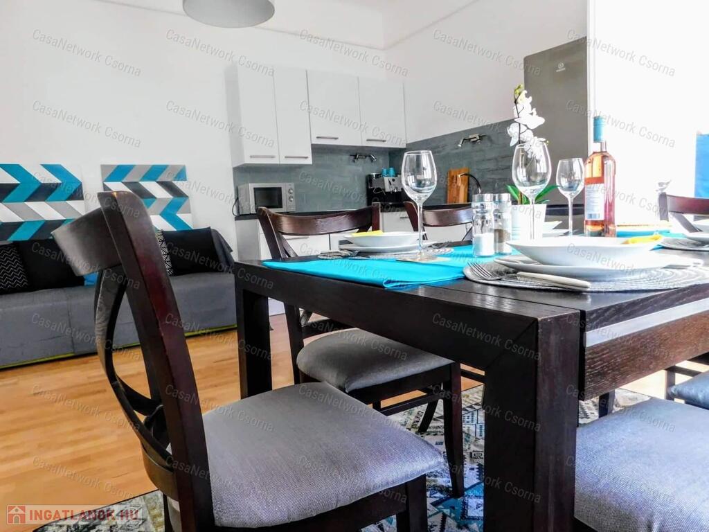 Győr szigetben, a Bercsényi liget 52. szám alatt, öt lakásos társasházban alacsony rezsijű, földszinti, téglaépítésű 74 m2-es polgári lakás eladó. Az ingatlan rendkívül jó alaprajzi elrendezésű. A lakás egy a lépcsőházból nyíló lakáshoz tartozó gangról nyílik. Egy amerikai konyhás nappali, két hálószobából, egyik hálószobából nyíló gardróbból, egy zuhanyzós és wc-t is tartalmazó fürdőből és egy különálló wc -ből áll. A fürdő és a wc ( light hof ) légudvarra szellőzik. A meleg vízről és a fűtésről radiátoros hőleadók és egy kondenzációs gázkazán gondoskodnak (saját bélelt kémény). A 2020 - ban történt teljeskörű felújítás során kismértékben az alaprajz is, valamint a teljes gépészet, a villany, víz, és gáz vezetékek kicserélésre kerültek. Természetesen a közművek felújításán túl az összes burkolat is megújult.A pincében külön 15 m2-es saját tároló, padlásrész. Parkosított, zárt belső udvar.Belváros, egyetem, élményfürdő, bevásárlóközpont karnyújtásnyira találhatók. Kiváló lakóközösség.Amennyiben bármilyen kérdés felmerül, szeretne meggyőződni róla, hogy milyen szép, kultúrált hívjon bármikor.Simon Kázmér 30 216 5557