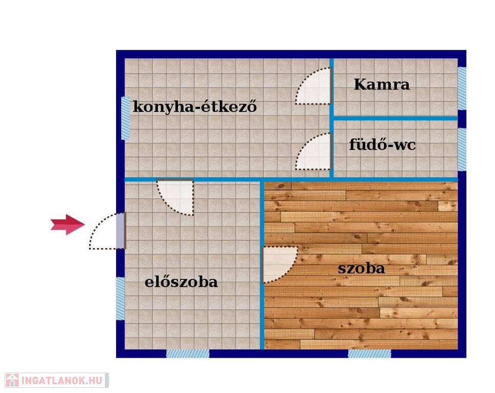 A ház egy szoba, nagyon tágas konyha , nagy méretű kamra, felújított fürdőszoba, és egy napfényes előszoba helységekből áll.