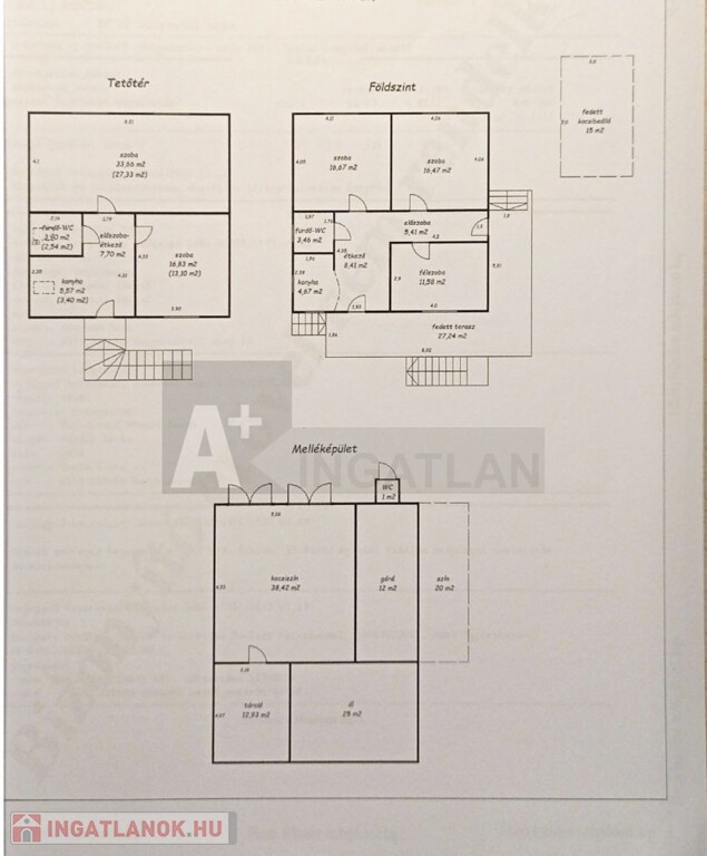 Melléképület : dupla garázs 38,42 m2, tároló 12,93 m2, góré 12 m2-es , ól 25m2-es és egy udvari , ugyanakkor angol wc .Az épületek mögött pedig a kert , gyümölcsfákkal .