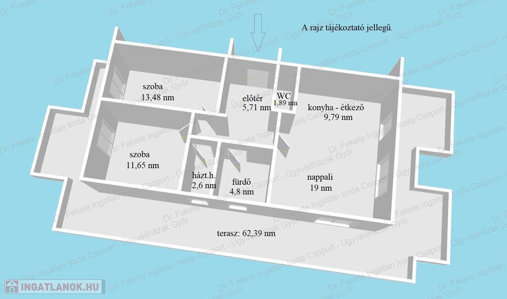 3 oldalról világos lakás, körbe 62,39 nm-es terasz (nevezhetjük akár Penthouse-nak is)