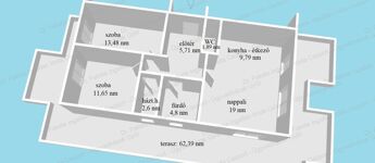 72,97 nm lakótér: Konyha - étkező - nappali + 2 szoba, fürdő, külön WC, háztartási helyiség (ideális családi méret) Nincs felső szomszéd, minden közel van, új építésű ingatlan.