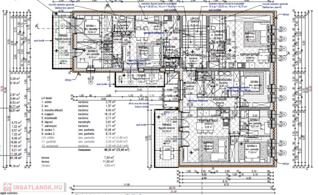 (nettó 73.52 m2) + 11 m2, 7 m2, 5,92 m2 teraszokkal első emeleti belső kétszintes. Amerikai konyhás nappali, 3 hálószoba, előszoba, közlekedő, gardrób, 2 fürdőszoba, külön wc került kialakításra.