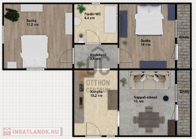 Az egyszintes kialakítás ideális azoknak, akik szeretik a könnyű és tágas elrendezést. A 65 négyzetméteres lakótér két hálószobát, egy tágas nappali-étkezőt, egy kényelmes konyhát, egy fürdőszobát és két erkélyt tartalmaz.