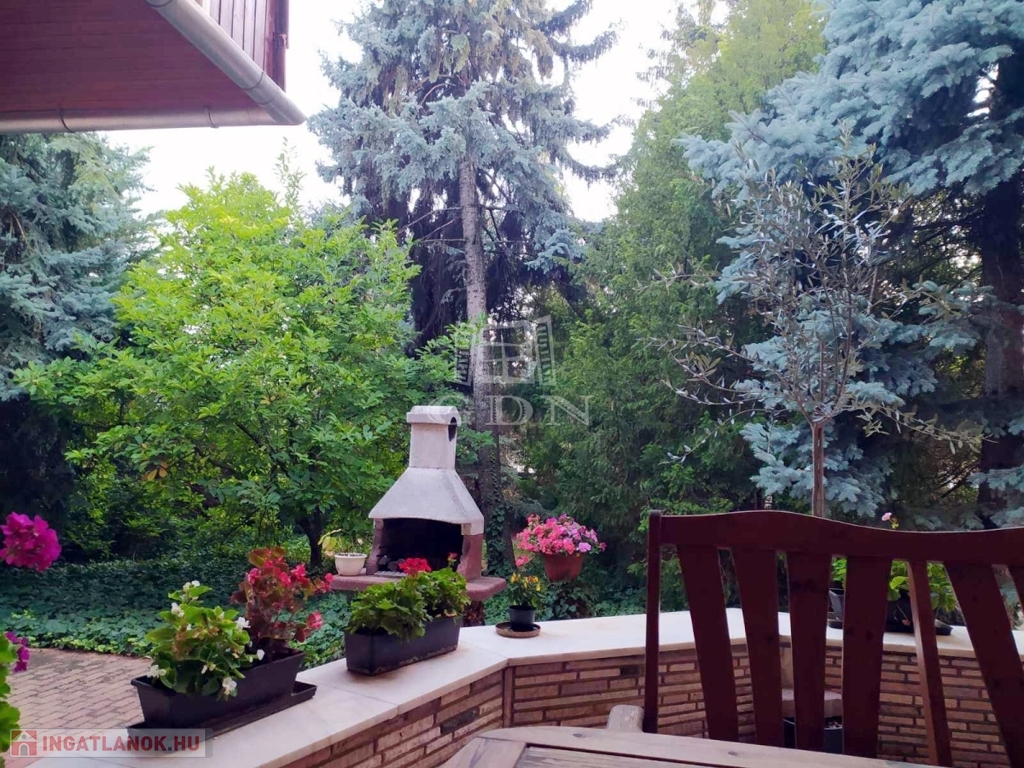 A házhoz három terasz tartozik, melyek gyönyörű kilátást nyújtanak a parkosított kertre, ahol számos fenyőfa és más növény található, amelyek még hangulatosabbá teszik a környezetet.