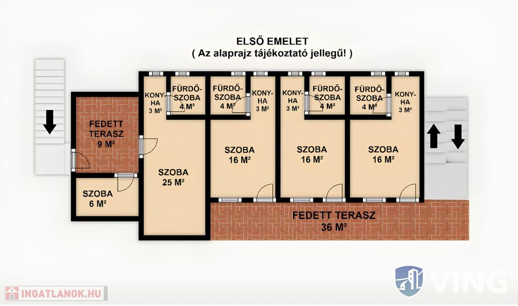 Az apartmanok elrendezése lehetővé teszi a tulajdonosnak és/vagy a gondnoknak is az állandó ott tartózkodását, mivel 2 apartman a ház egyik oldaláról közelíthető meg, míg a többi 13 a ház másik oldaláról, így azok elszeparáltan használhatóak. A ház alatt egy nagy 25 m2-es pince található, mely jelenleg gépészeti helyiségként valamint műhelyként funkcionál.