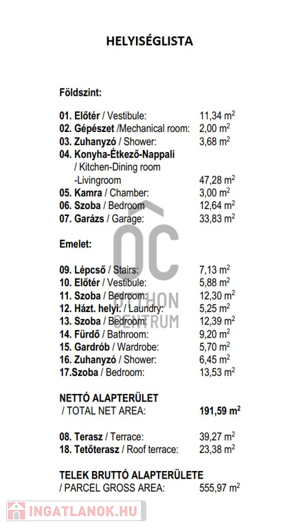 Az ingatlan alapterülete 191 nm, míg a telek mérete 555 nm.