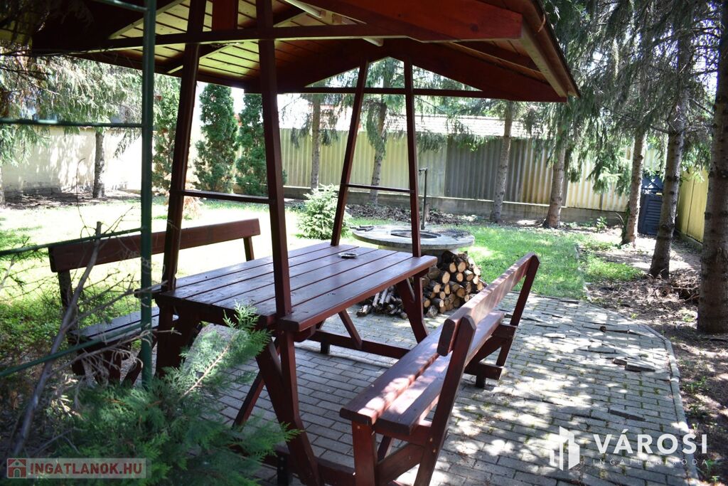 A ház igényesen körbekerített, parkosított udvarát egy kapun keresztül lehet megközelíteni, majd az udvar végén található dupla garázst használni. A garázsban villany, víz található. Az udvar végén egy hűvös, fákkal körbeültetett kiülő és egy szép sütő hely is ki lett alakítva.