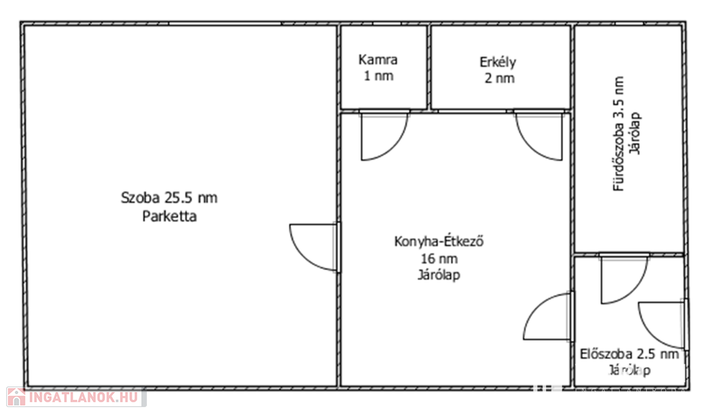 Helyiségei: 1 szoba, konyha-étkező, kamra, fürdőszoba, előszoba, erkély.
