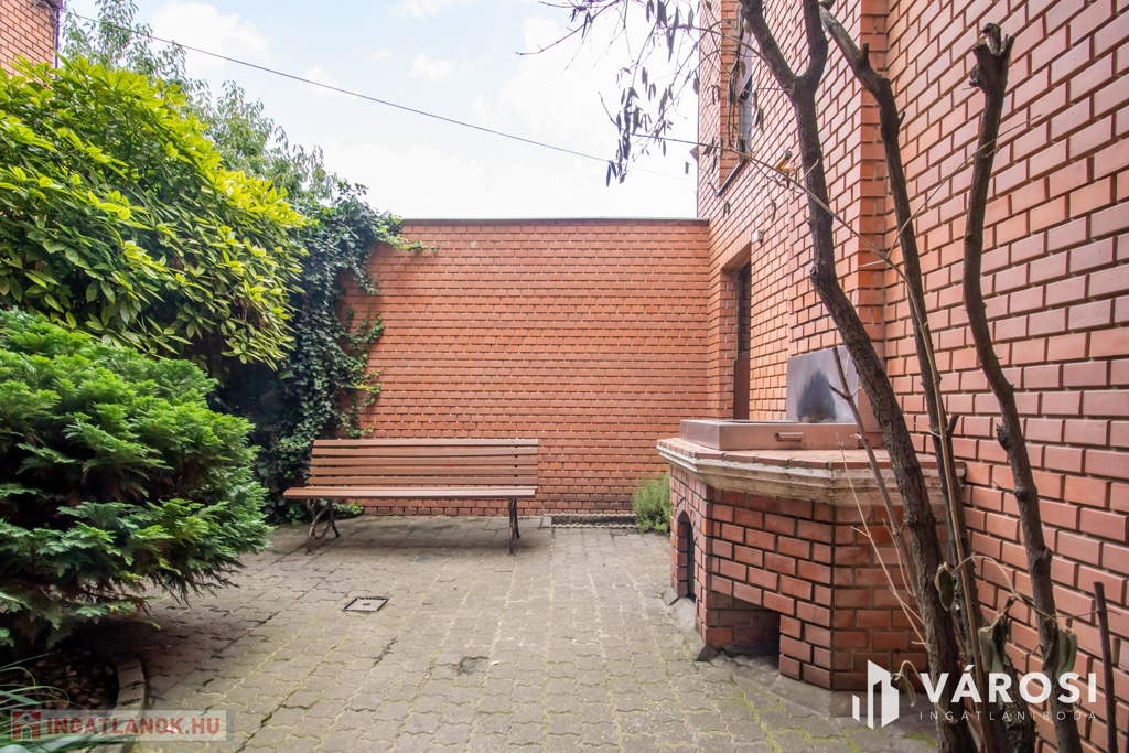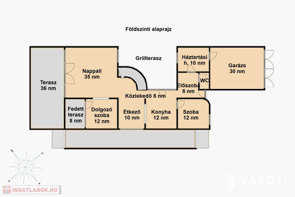 Az épület egy 1118 négyzetméteres parkosított telken fekszik. A földszinten nappali, étkező, hatalmas konyha, 2 szoba, egy WC, háztartási helyiség kapott helyet 105 négyzetméteren. Ide csatlakozik a 30 négyzetméteres dupla garázs is. A konyhából nyílik egy külön grillterasz is. A nappaliból közvetlen kijárat van a szeparált belső udvarra, ahol egy hatalmas terasz kapott helyet, melynek egy része ráadásul fedett is. A teraszon bőven van hely egy jakuzzinak vagy akár egy szaunának is.