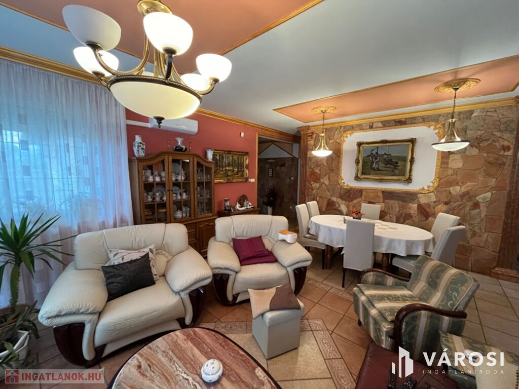 Debrecen Csendes madárdalos környezetében, 240 nm-es 4 szoba nappalis, 2 fürdőszobás, 2 konyhás, 2 teraszos, és természetesen 2 garázsos igényesen minőségi anyagokból megépített családi birtok, 3200 nm-es parkosított szép kerttel eladó. A házban található még egy nagy mosókonyha, és egy gardrób szoba is. A telken található egy nagy méretű filagória, egy kis faház, és egy épített tároló valamint egy baromfi ól. A hátsó kertben pedig egy kis fenyőerdő teszi varázslatossá a hely szépségét, és levegőjét. Az ingatlanon most került bevezetésre a három fázisú áram, és egy 10 KV-os napelemes rendszer is telepítésre került, így a ház nagyon energia takarékos! Ha egy igazán meghitt csendes családi otthonra vágyik, megtalálta! Nézze meg és beleszeret!