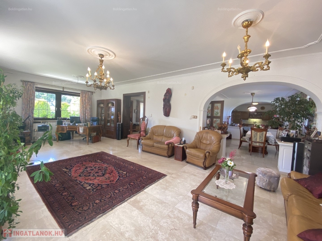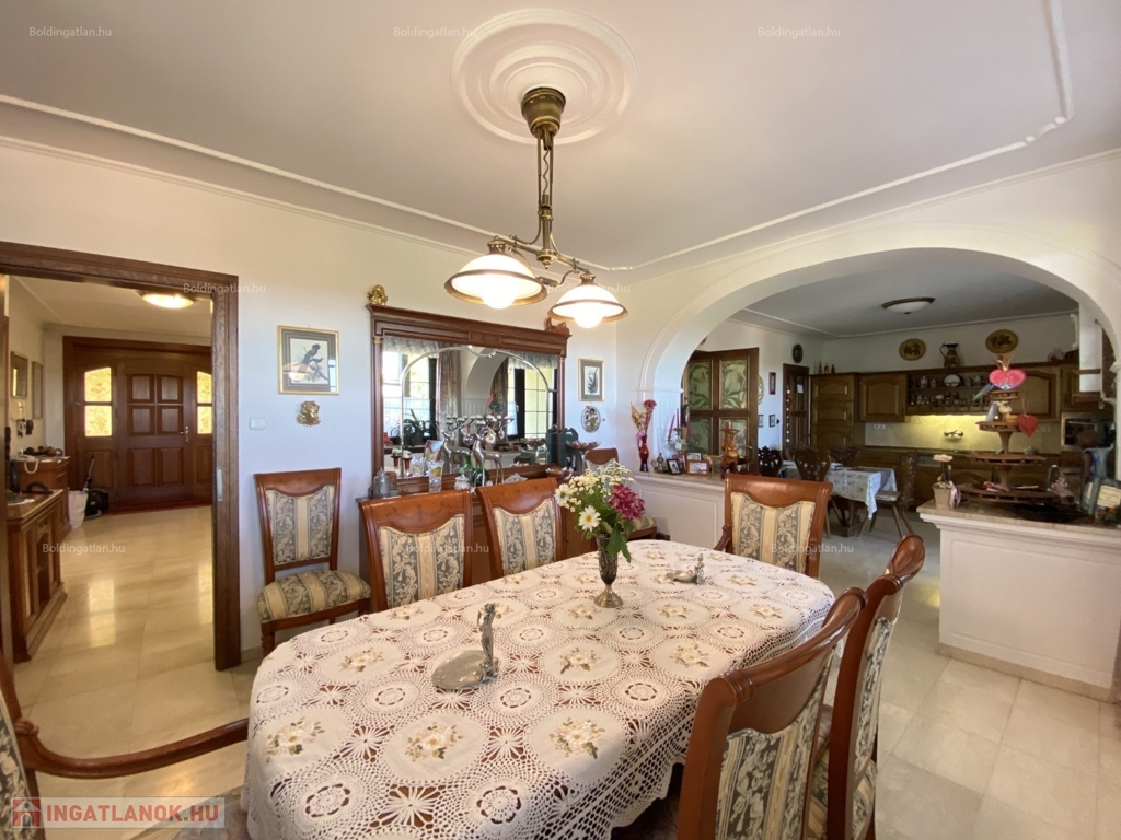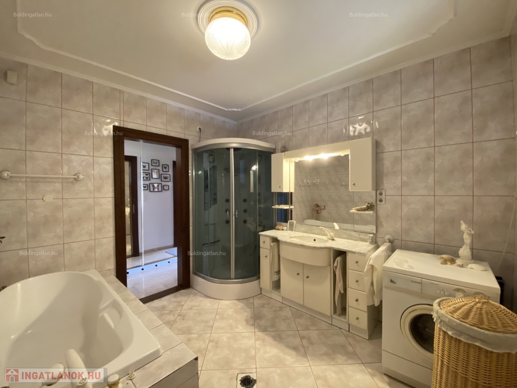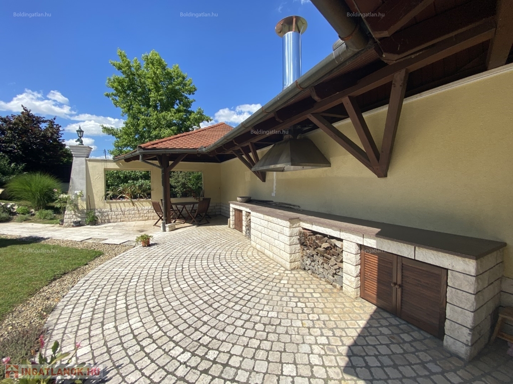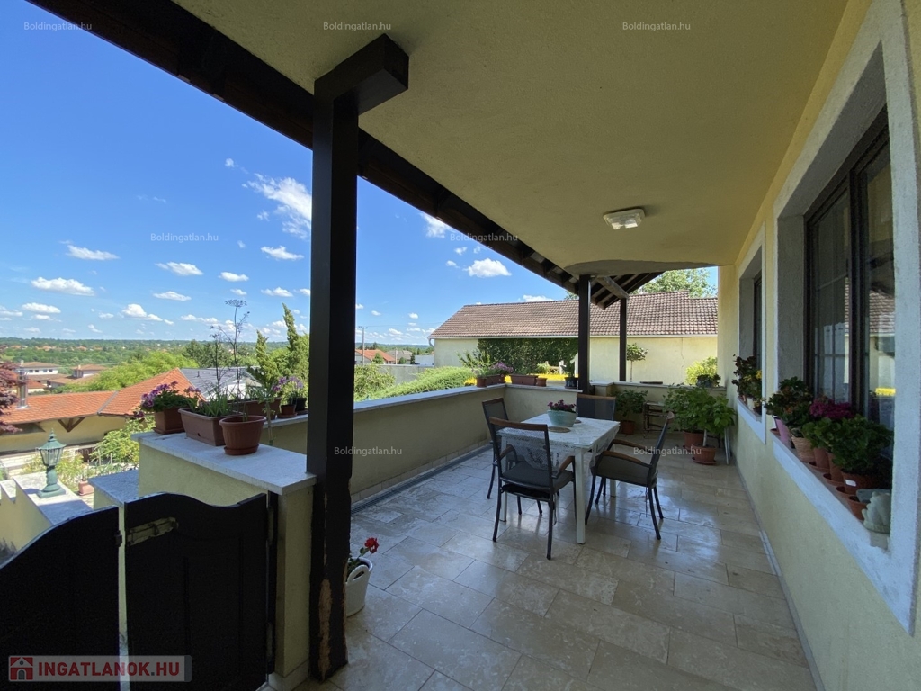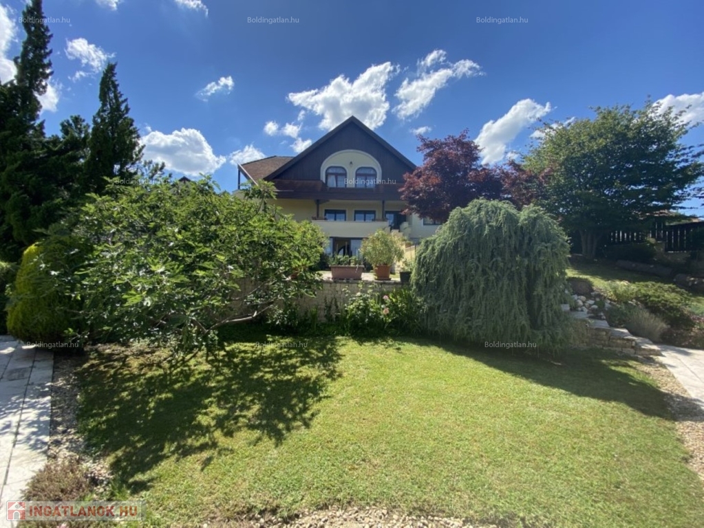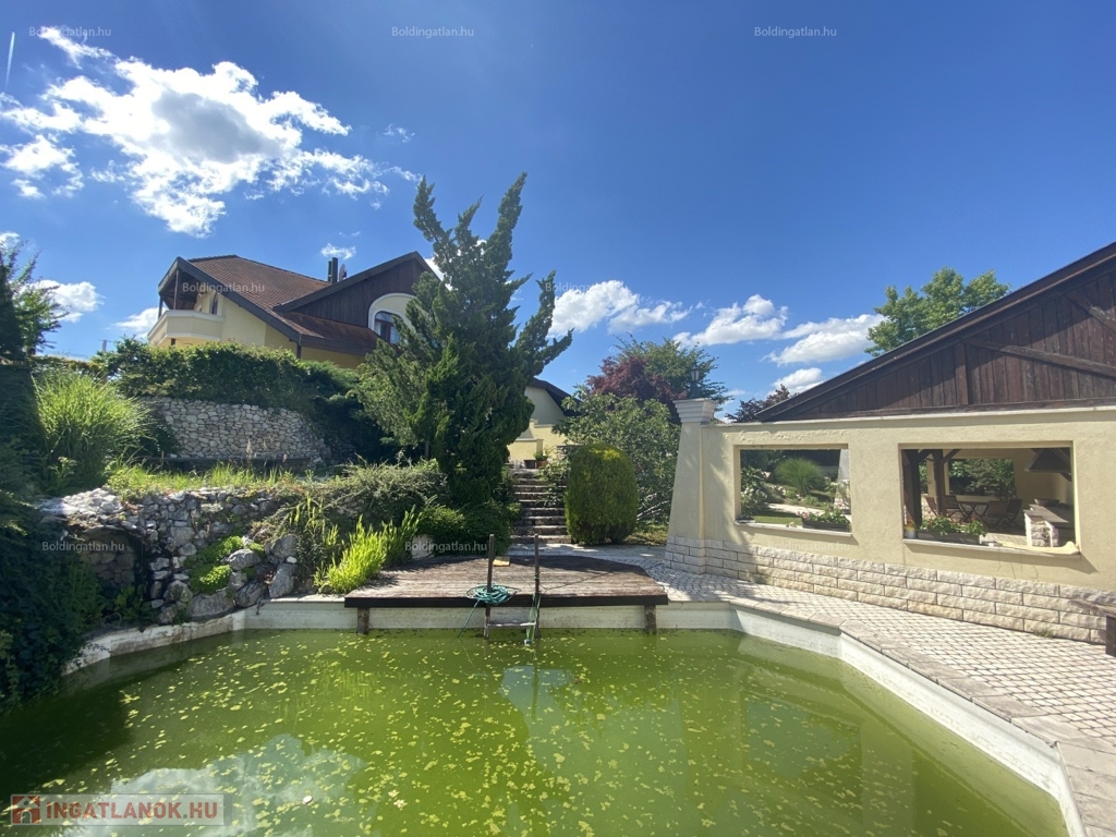 Kaposváron a Donner városrészben, kifejezetten csendes környezetben lévő, örök panorámás, igényesen megépített családi ház, gondozott udvarral, 2 autó részére kocsibeállóval, garázzsal eladó. A lakóház alsó szintjén (160 m2) tágas előszoba-közlekedő, fedett terasz, nappali, étkező, konyha, kamra, további 1 szoba, fürdőszoba-wc, illetve tároló helyiségek kerültek kialakításra. A tetőtérben (93 m2) gyönyörűen megmunkált látszó gerendás nappali panorámás terasszal, további 3 szoba, közlekedő, fürdőszoba-wc, és dolgozószoba helyiségek találhatóak A 160 m2-es szuteréneben party helyiségnek alkalmas nagy tér, nyári konyha, zuhanyzó-wc, téli kert, valamint és borospince vannak. Az épület fűtése és melegvíz ellátása gázközponti kazánnal és 2 db hőszivattyúval megoldott, az elektromos energia ellátását 10 kWh-os napelemrendszer biztosítja, továbbá a földszinti és az emeleti nappaliban légkondícionáló van felszerelve. Az igényesen parkosított udvarban számos növény, valamint grillterasz, napozó és medence vannak, valamint 2 db automata kapu és garázsajtó, illetve riasztó került felszerelésre. Telek: 1.630 m2