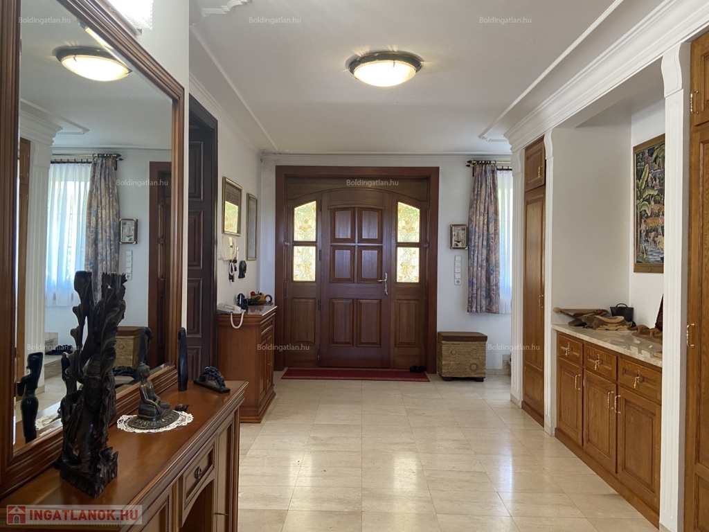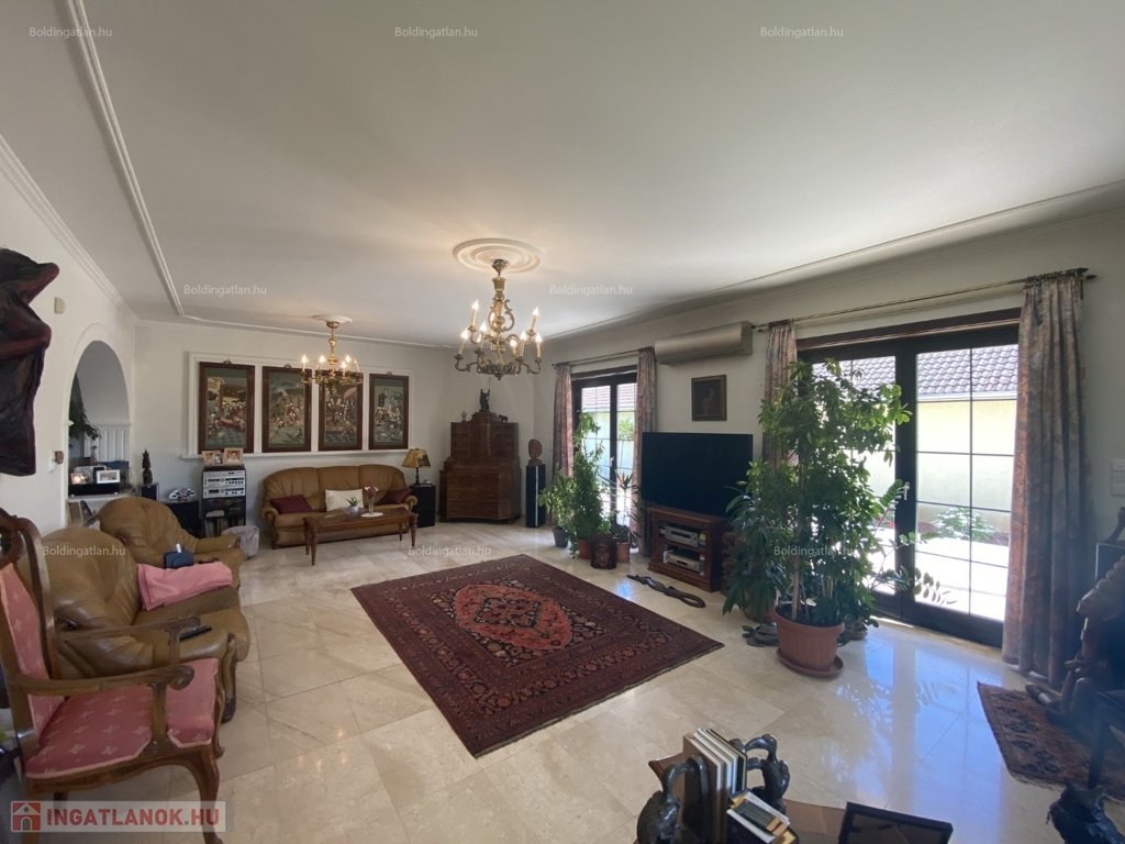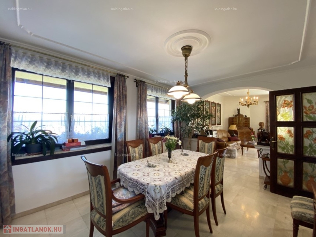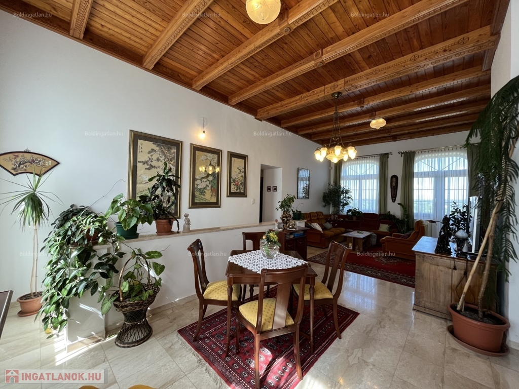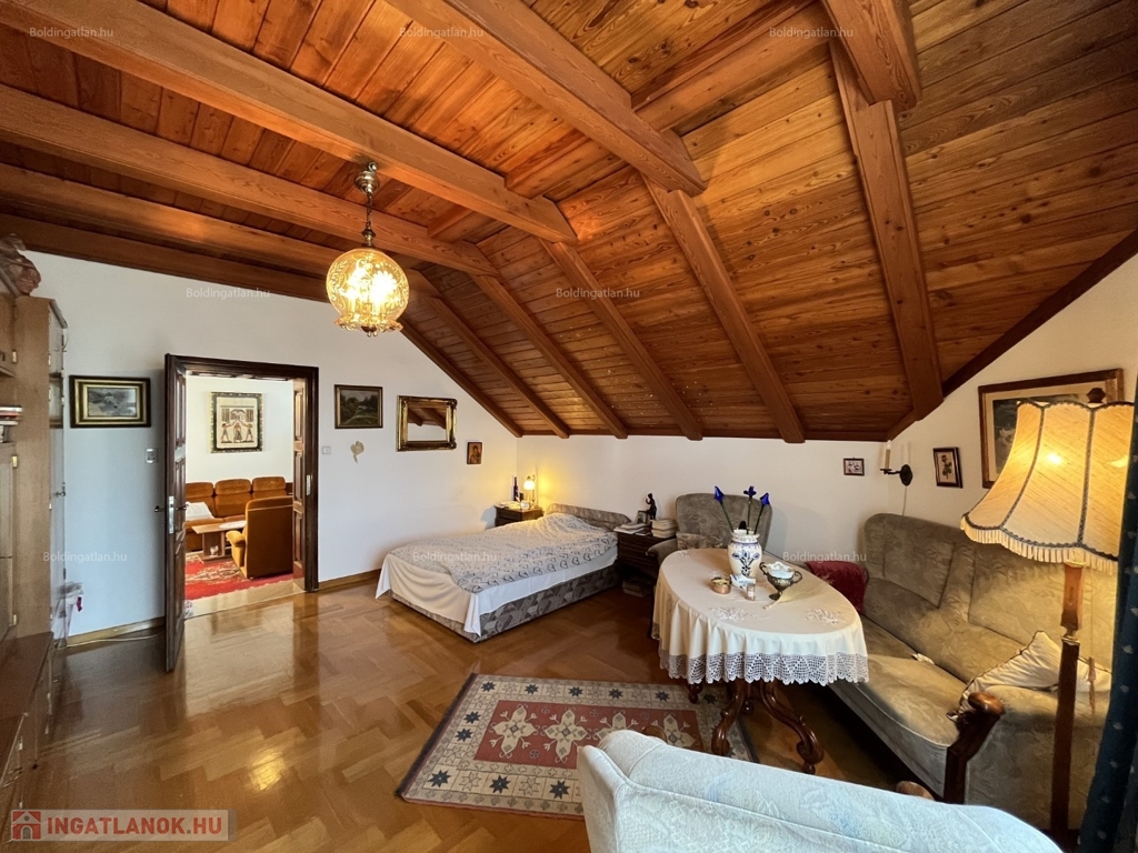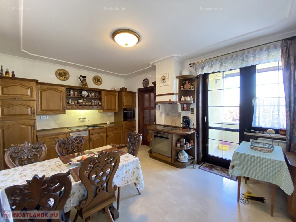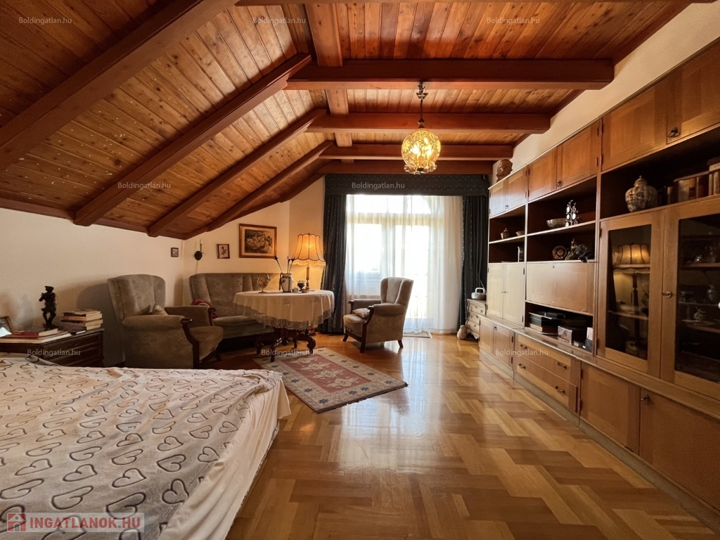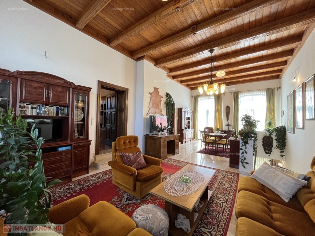 Kaposváron a Donner városrészben, kifejezetten csendes környezetben lévő, örök panorámás, igényesen megépített családi ház, gondozott udvarral, 2 autó részére kocsibeállóval, garázzsal eladó. A lakóház alsó szintjén (160 m2) tágas előszoba-közlekedő, fedett terasz, nappali, étkező, konyha, kamra, további 1 szoba, fürdőszoba-wc, illetve tároló helyiségek kerültek kialakításra. A tetőtérben (93 m2) gyönyörűen megmunkált látszó gerendás nappali panorámás terasszal, további 3 szoba, közlekedő, fürdőszoba-wc, és dolgozószoba helyiségek találhatóak A 160 m2-es szuteréneben party helyiségnek alkalmas nagy tér, nyári konyha, zuhanyzó-wc, téli kert, valamint és borospince vannak. Az épület fűtése és melegvíz ellátása gázközponti kazánnal és 2 db hőszivattyúval megoldott, az elektromos energia ellátását 10 kWh-os napelemrendszer biztosítja, továbbá a földszinti és az emeleti nappaliban légkondícionáló van felszerelve. Az igényesen parkosított udvarban számos növény, valamint grillterasz, napozó és medence vannak, valamint 2 db automata kapu és garázsajtó, illetve riasztó került felszerelésre. Telek: 1.630 m2