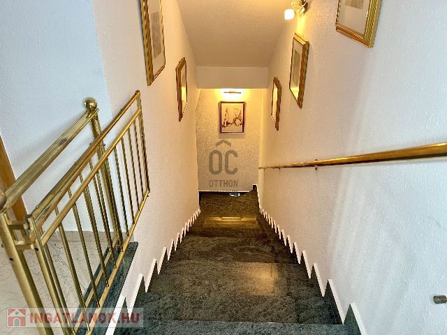 Az alsó szintre márványlépcső vezet le itt került kialakításra a szülői hálószoba, amely gardróbbal rendelkezik, valamint egy vendégszoba is, a két lakrészhez közös terasz csatlakozik. Ezen felül káddal, zuhanyzóval, wc-vel, bidével felszerelt fürdőszoba és tároló valamint mosó helyiség is kialakításra került.