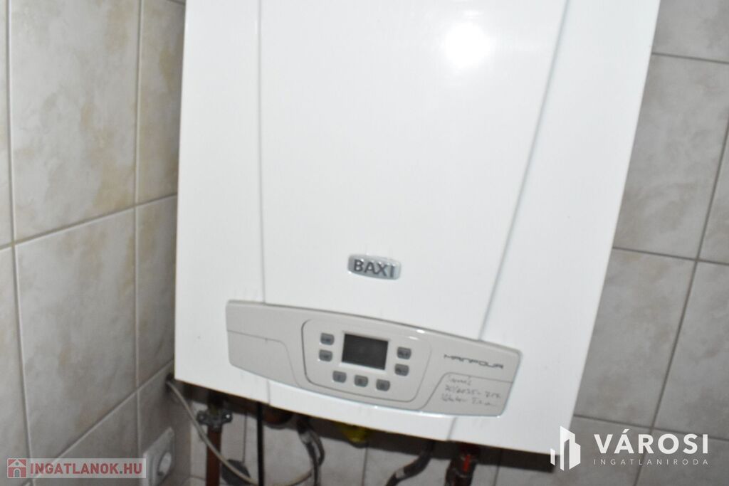 A közlekedőből nyíló üzletrész-konyha, tárgyaló laminált padlós, a tetőtéri ablakok fából vannak, a fűtése kombi gázkazánnal megoldott - radiátor hőleadókkal. Továbbá be van üzemelve 3 db. klímaberendezés, így az összes helység klimatizált.