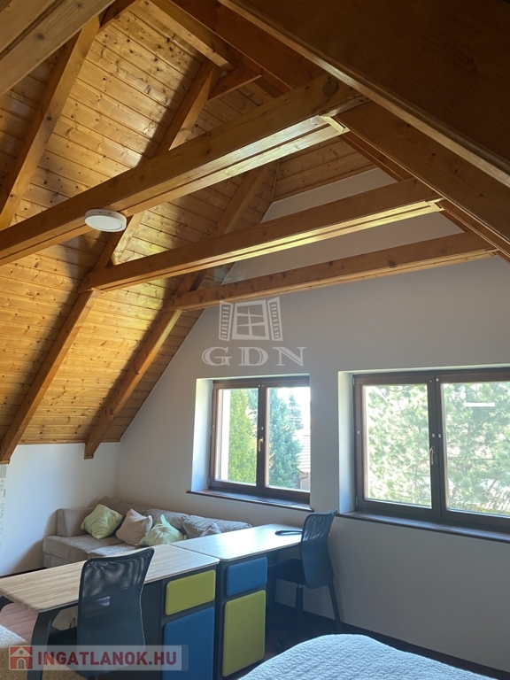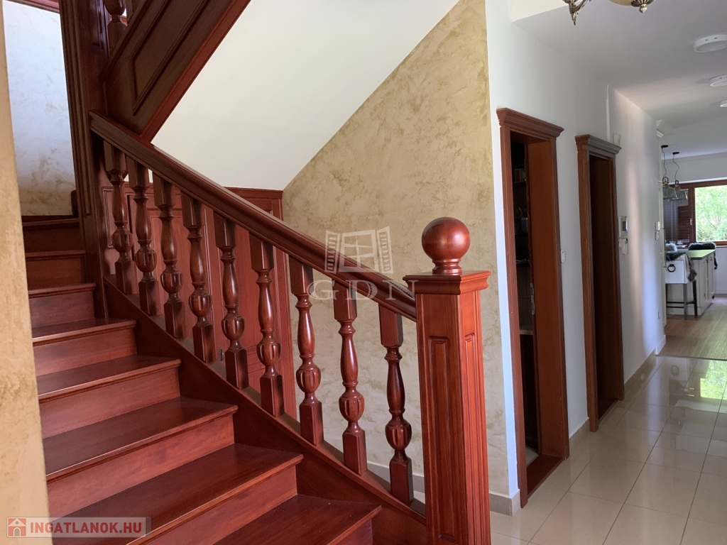 Az egész épületben a fa meleg hangulata dominál. Az emeleten látszó gerendák, a fürdőszobában teakfa burkolat, a fakorlát a lépcsőfeljáróban, az egyedi készítésű fa beltéri ajtók, mind melegséget árasztanak.
