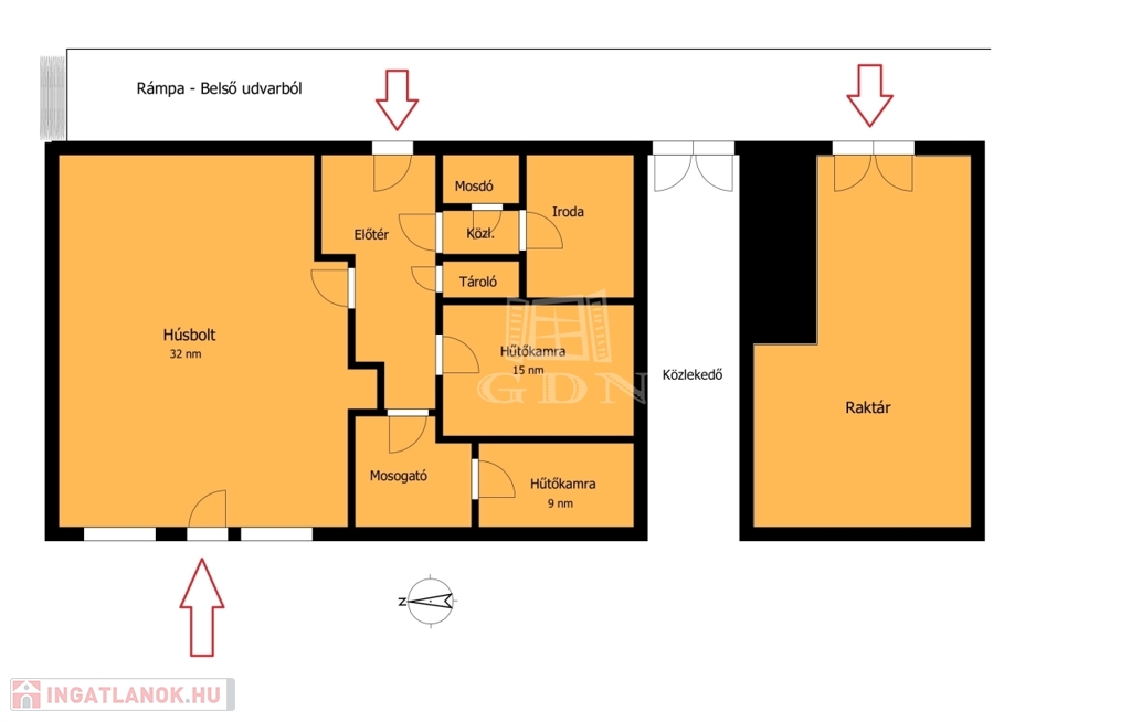 A bérlemény gépesítéséhez egy 9 és egy 15 nm -es hőtőkamra is tartozik. Valamint a hirdetés képein is látható fali húsfogas, és 2 db csemegepult, illetve fagyasztóládák.